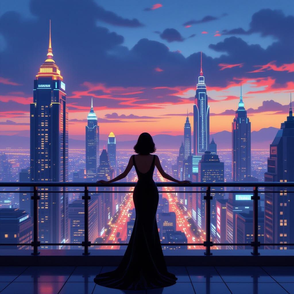 This image shows a woman on a balcony viewing a retro-futuristic city at dusk. The art deco and chrome architecture is lit by neon signs and streetlights, with a vibrant sky. Rendered as digital art with cinematic lighting.