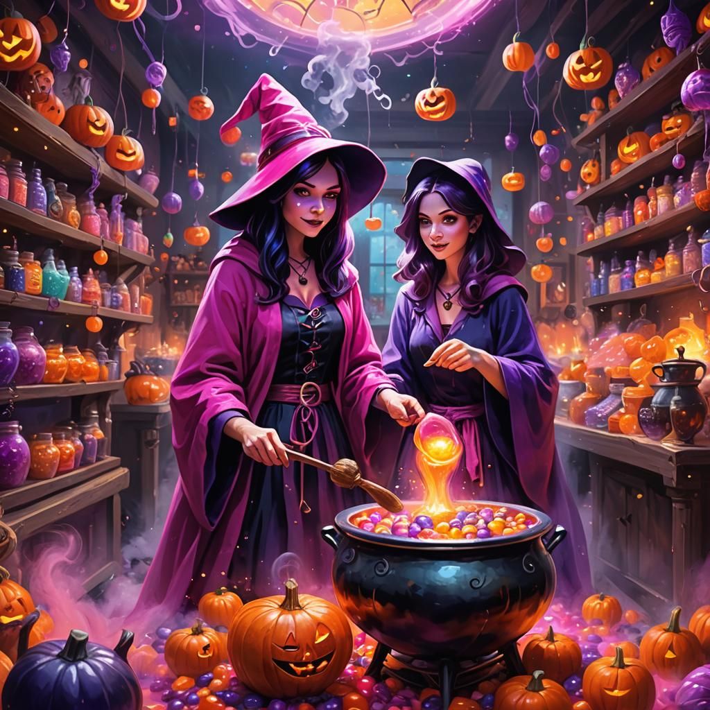 This image shows a cute witch in a magical candy store scooping candy from a cauldron. The vibrant oil painting features glowing jack-o-lanterns, twinkling string lights and a vivid triadic color scheme.