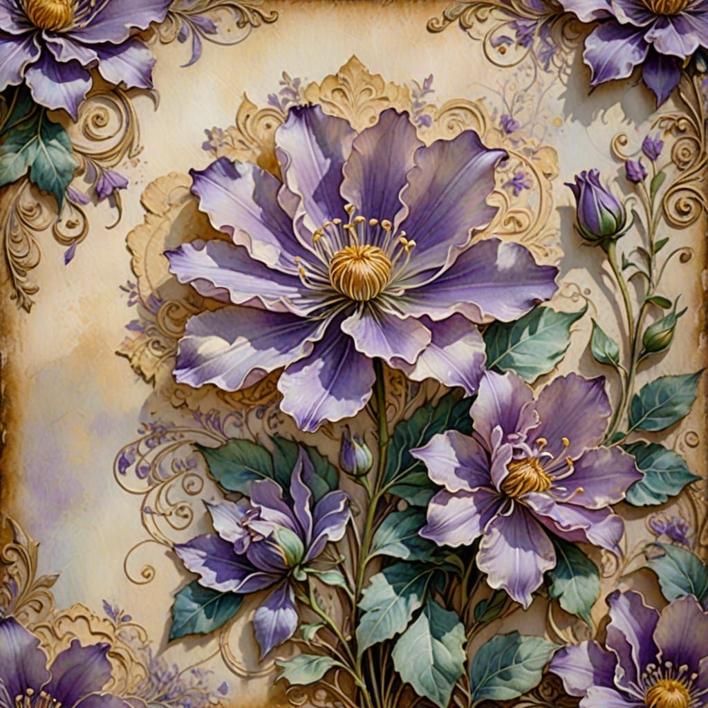 A delicate, hand-painted watercolor of pastel flowers with intricate, metallic details and calligraphy on aged parchment, reminiscent of mixed media art from the early 20th century.