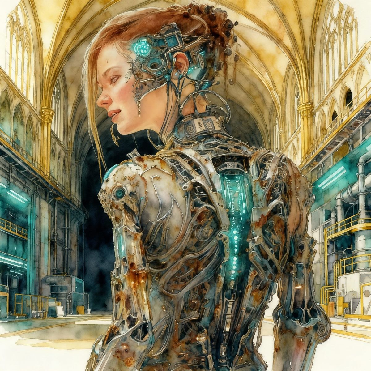 A full-palette watercolour of a damaged cyborg woman (corroded biomechanical components; flickering neon blue/teal LED accents; anodized titanium exoskeleton; chestnut hair; tired expression); an enormous vaulted chamber (Gothic architecture; modern industrial facility style construction) stretches off ...