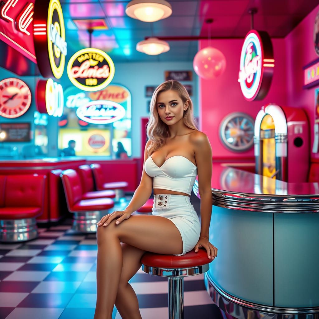 This image shows a blonde woman in retro attire at a diner. The scene features a classic jukebox, checkered floor, and neon, capturing a nostalgic Americana vibe. The art style evokes the 1950s.