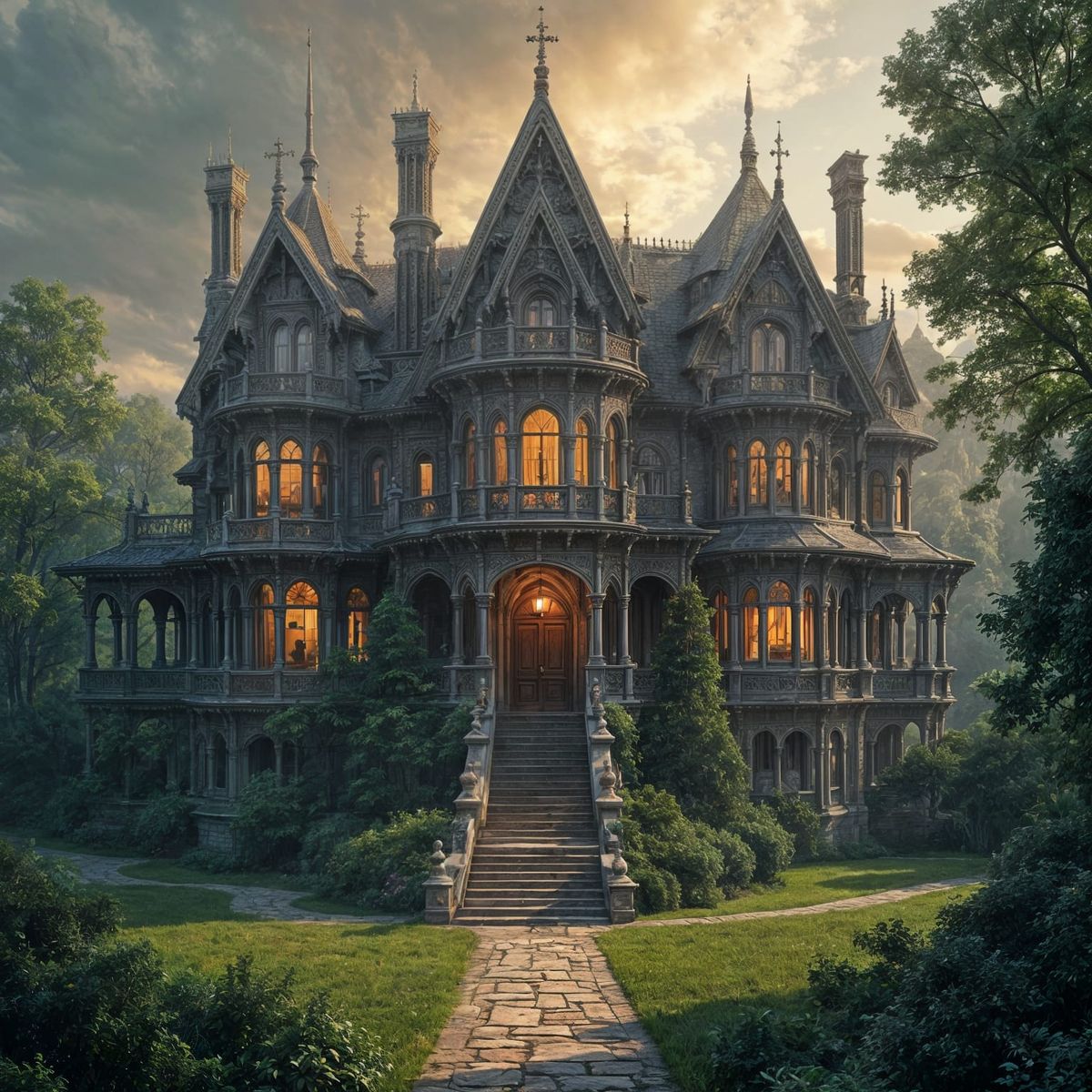 This image shows a breathtakingly detailed house, crafted with meticulous attention to every aspect, from architecture to atmosphere, in a style reminiscent of epic cinematic digital matte paintings.