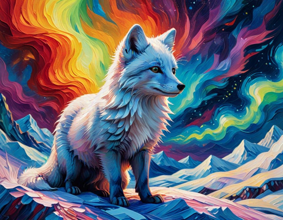 A textured painting of an arctic fox silhouetted against the Northern Lights. The impasto artwork uses dramatic lighting and vivid colors to capture the dynamic, otherworldly arctic scene.