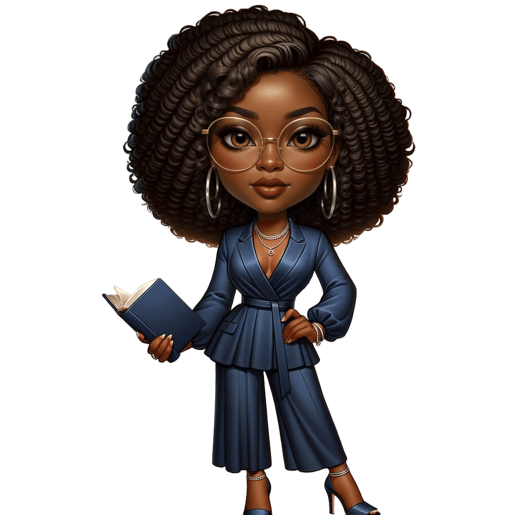This image shows a stylish Black woman confidently holding a book. She has curly hair, wears glasses and minimal jewelry. She is dressed in a flowy blue outfit and heels. The digital art is framed in a centered circular border.
