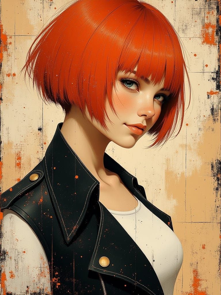 This image shows a young woman with a striking red bobbed hair, dressed in a black leather vest and white t-shirt, amidst a maximalist Art Nouveau aesthetic with subtle gothic undertones and soft oil painting textures.
