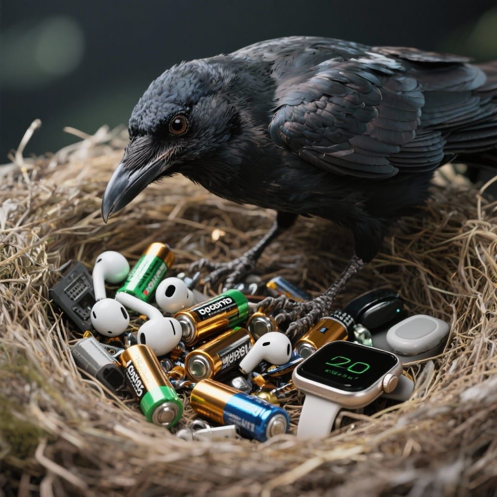 This realistic scientific illustration depicts a crow meticulously gathering discarded electronic items like batteries, earbuds, and smartwatches to build its nest.