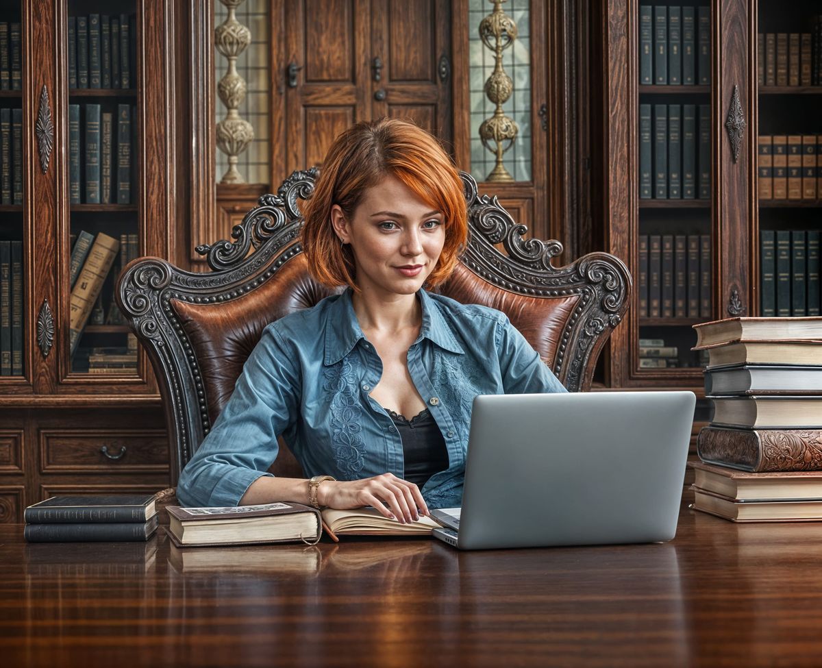 This image shows a red-haired CEO in her 30s at her mahogany desk. She wears a silk blouse, with books and papers stacked on the desk. The image has photorealistic rendering.