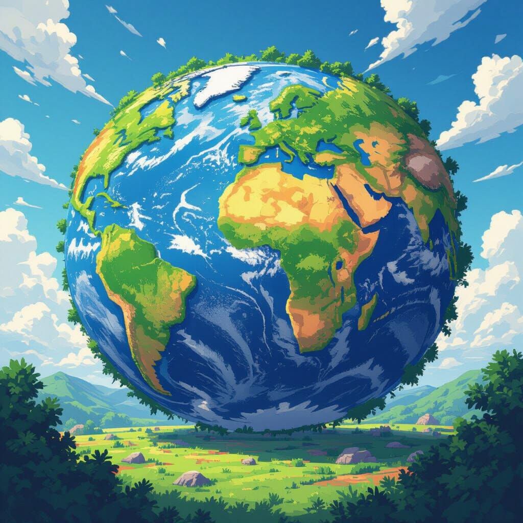 This image shows a vibrant, meticulously detailed pixelated Earth. The artwork features deep colors and cel-shaded textures in a flat manga scan style, with cinematic lighting, and a dynamic anime aesthetic.