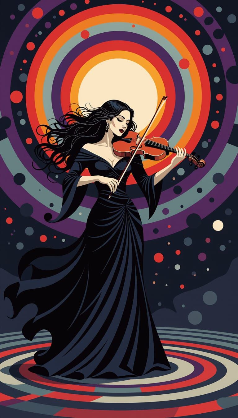 This image shows a mature, gothic violinist on a circular stage amidst abstract, rippling rings of color representing sound waves. The artwork is in a synesthetic vector abstraction style.