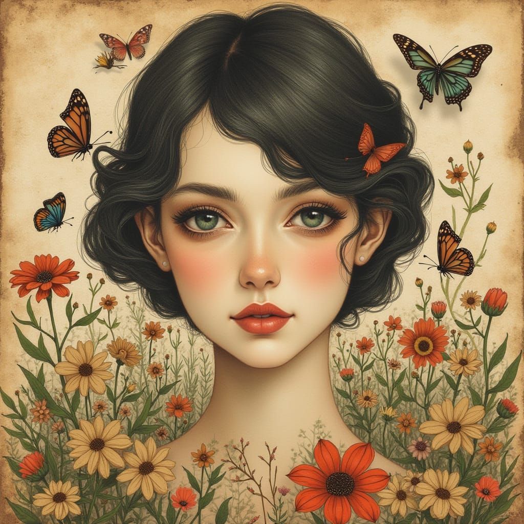 This image shows a woman amidst flowers and butterflies, presented as layered collage art. The image evokes a nostalgic, retro feel, utilizing warm sepia tones and intricate textures.