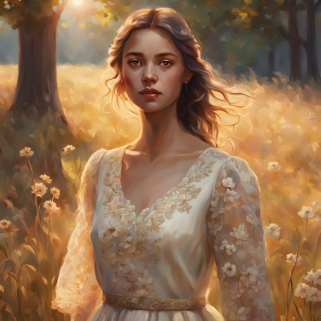 This image shows a woman in a cream dress with floral patterns, bathed in warm, ethereal golden sunlight. Rendered as a highly detailed, realistic oil painting with painterly elegance.