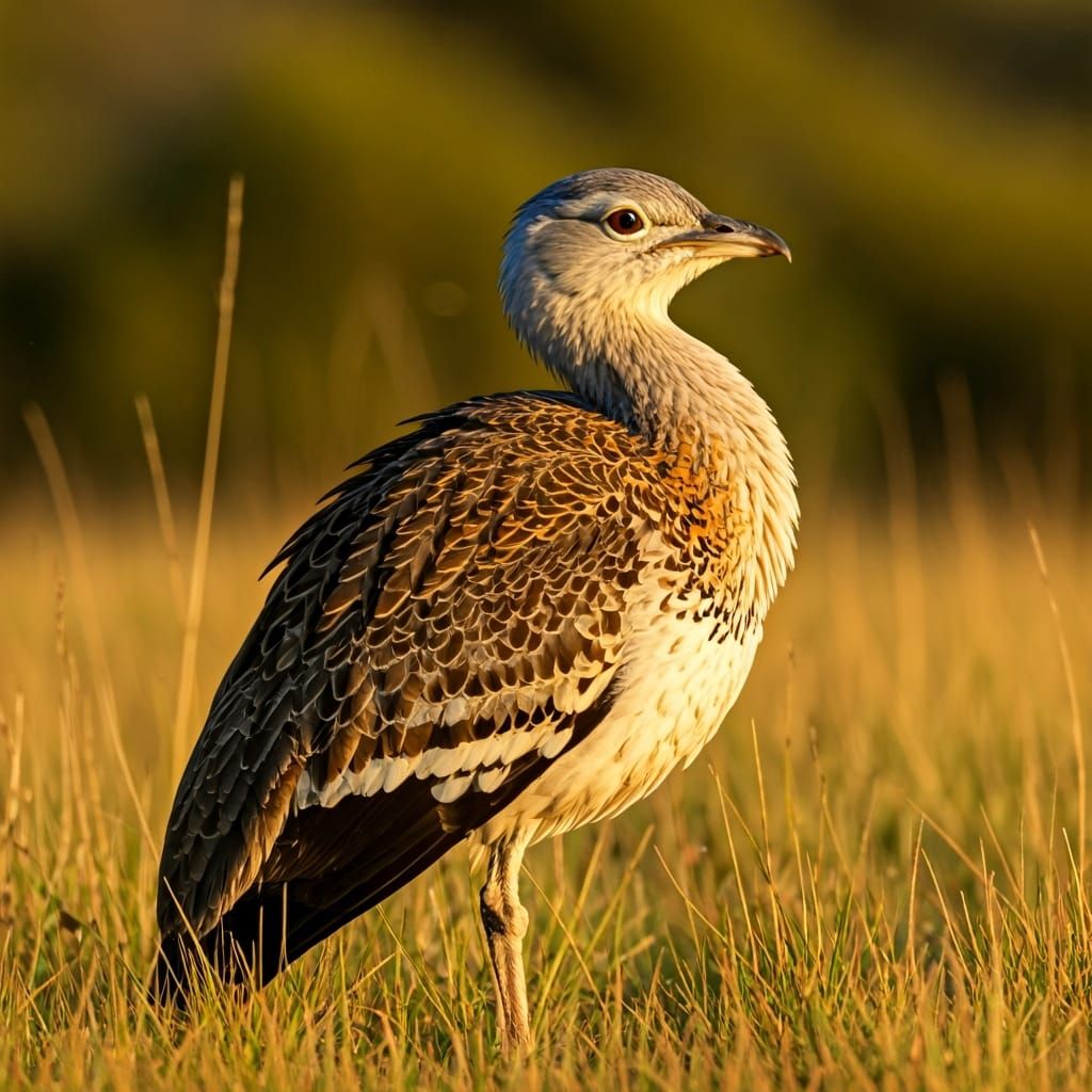 A detailed image of a bustard bird in its natural habitat, feathers slightly ruffled, illuminated by warm sunlight. The artwork features earthy tones and atmospheric depth.