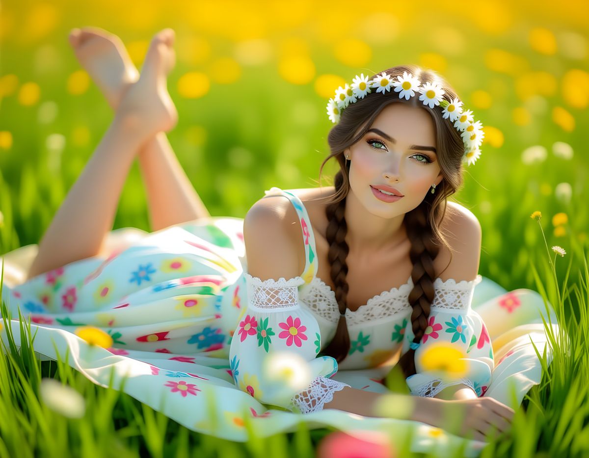 A striking picture of a woman in a summer dress lying in a flower-filled meadow. The image evokes a dreamy, idyllic atmosphere with soft focus and natural lighting reminiscent of classical painting.