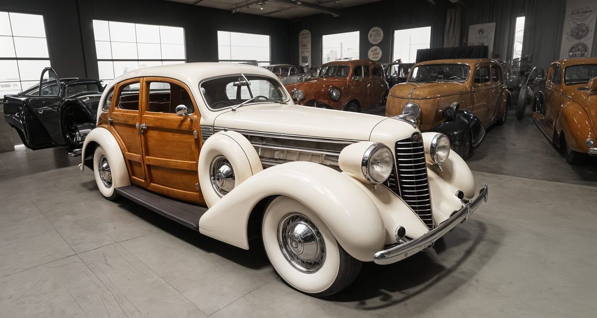 This image shows a white 1937 Duesenberg luxury car with a fastback design and intricate wood detailing. The car's design embodies the Art Deco style.