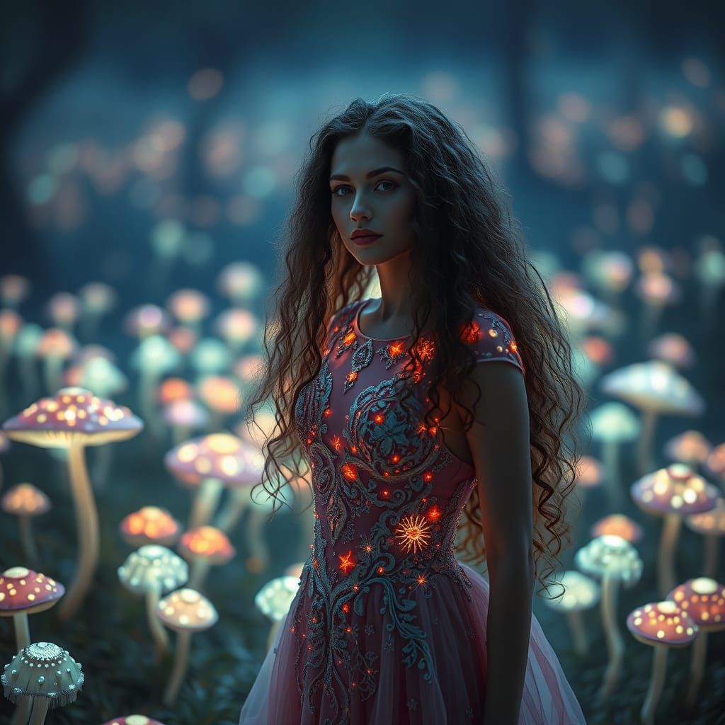 This image shows a woman with long hair in a starlight gown, standing in a field of glowing mushrooms. The artwork is in an Art Nouveau style, with soft pastel colors and luminous highlights.