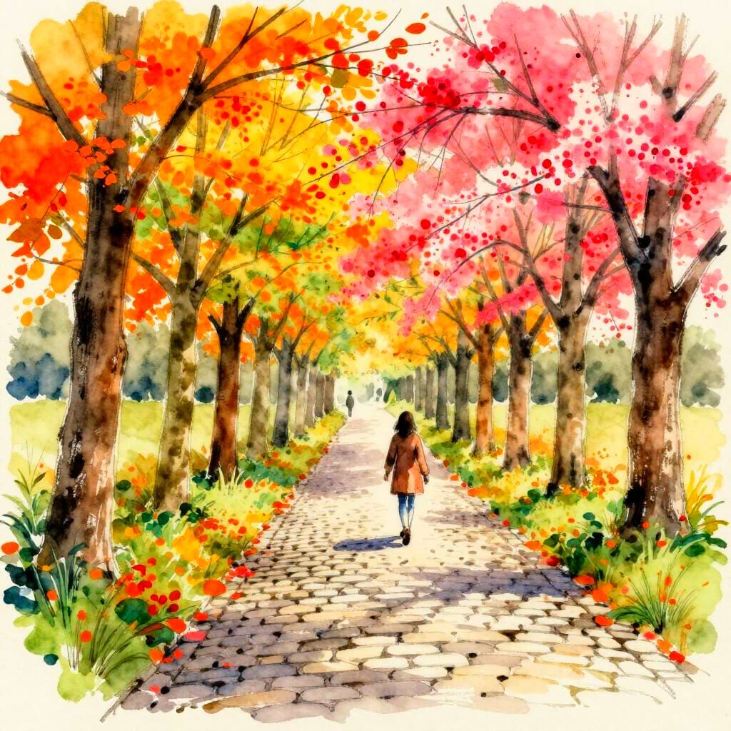 This image shows an idyllic, fairytale walking path with cobblestones and a flowering treeline, rendered in a maximalist charcoal and watercolour style with a vibrant colour splash.