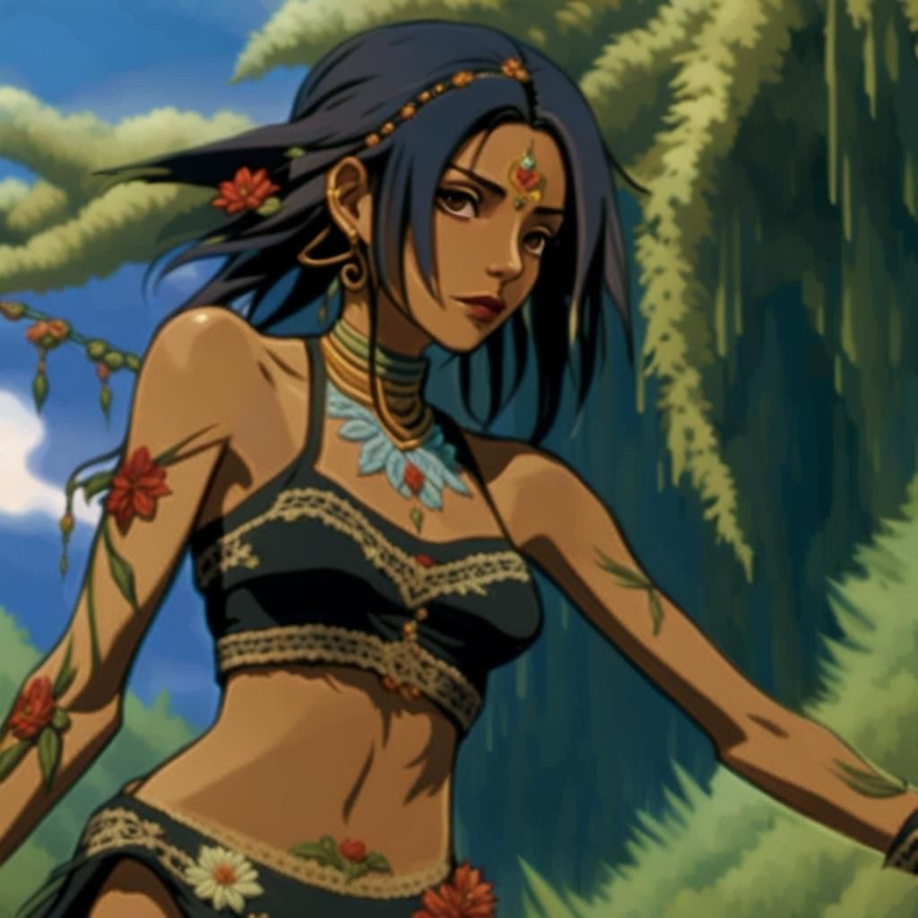 A vibrant image of a Mexican woman in a traditional dress alongside her soulmate in an ornate suit, set within a mystical forest. The artwork features deep blues and oranges with a cinematic fantasy aesthetic.