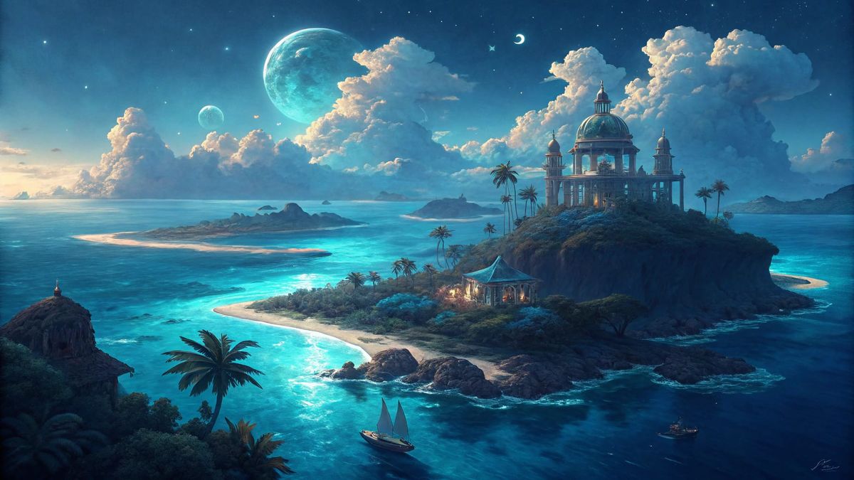 This image showcases a surreal dreamscape with vast blue skies meeting sapphire oceans. Islands of impossible shapes with glowing plants float among iridescent clouds, evoking wonder.