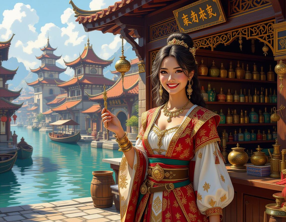 A cheerful merchant lady smiles while offering a hairpin in her shop. The shop is set in a fantasy harbor city and the scene is reminiscent of detailed fantasy concept art.