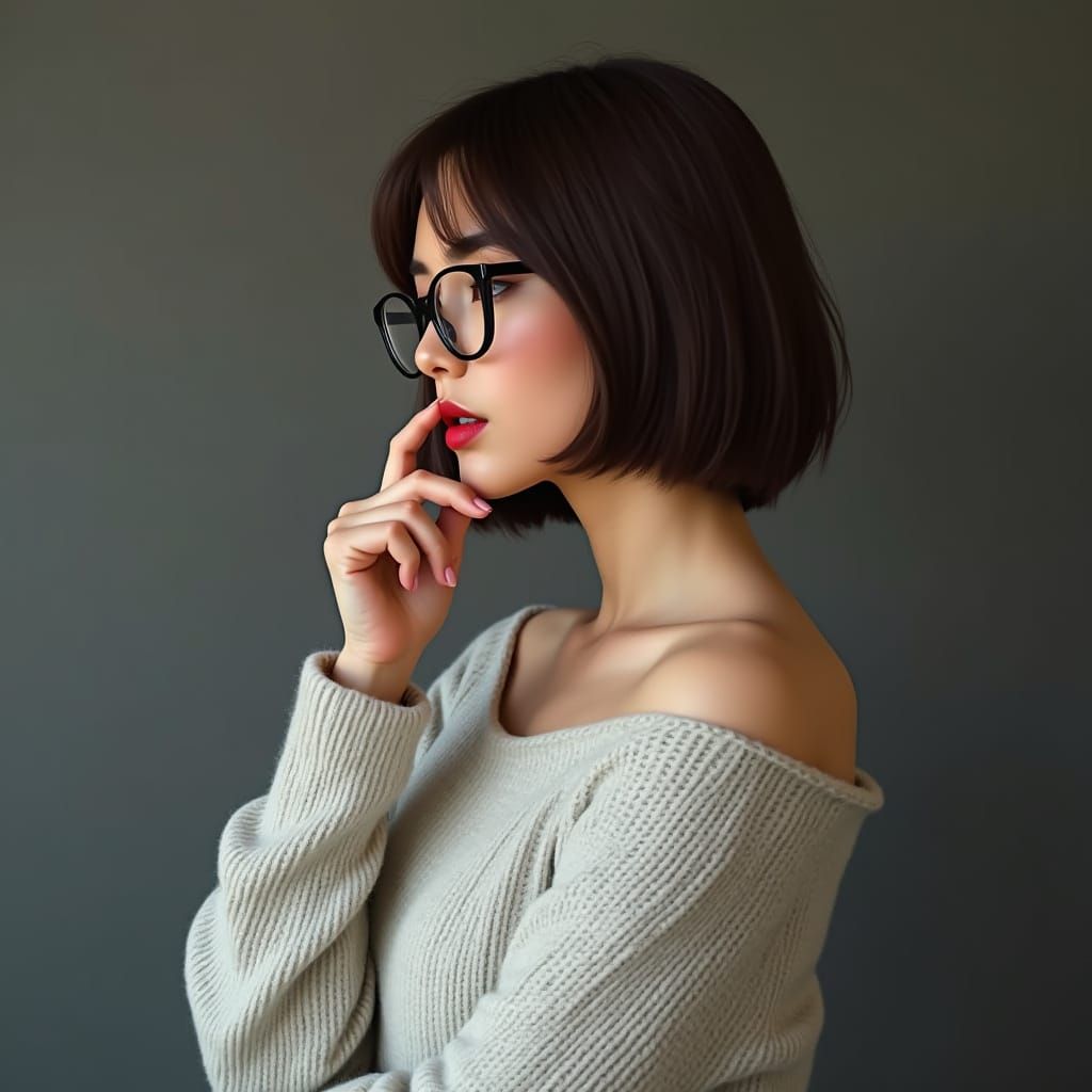 This image shows a hyperrealistic studio portrait of a woman in profile. She wears a light gray, off-the-shoulder knitted sweater, with her face artfully hidden from view.