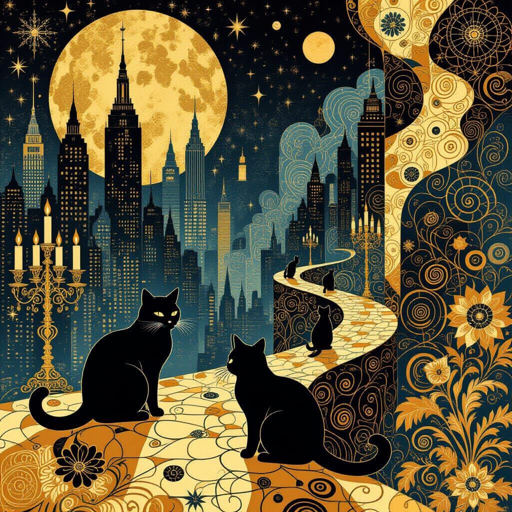 This image shows mysterious cats in a film noir cityscape with golden Klimt accents and Chagall wallpaper. The artwork features intricate Zentangle patterns and 3D shading.