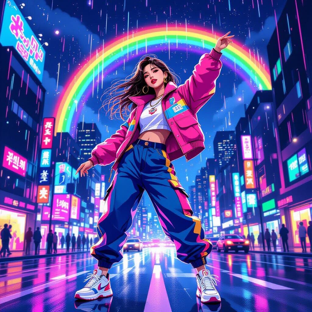 This image shows a K-pop girl dancing on a city street under a dark sky filled with rainbows. The artwork features bold lines, bright colors, and dynamic movement, in a modern illustrative style.