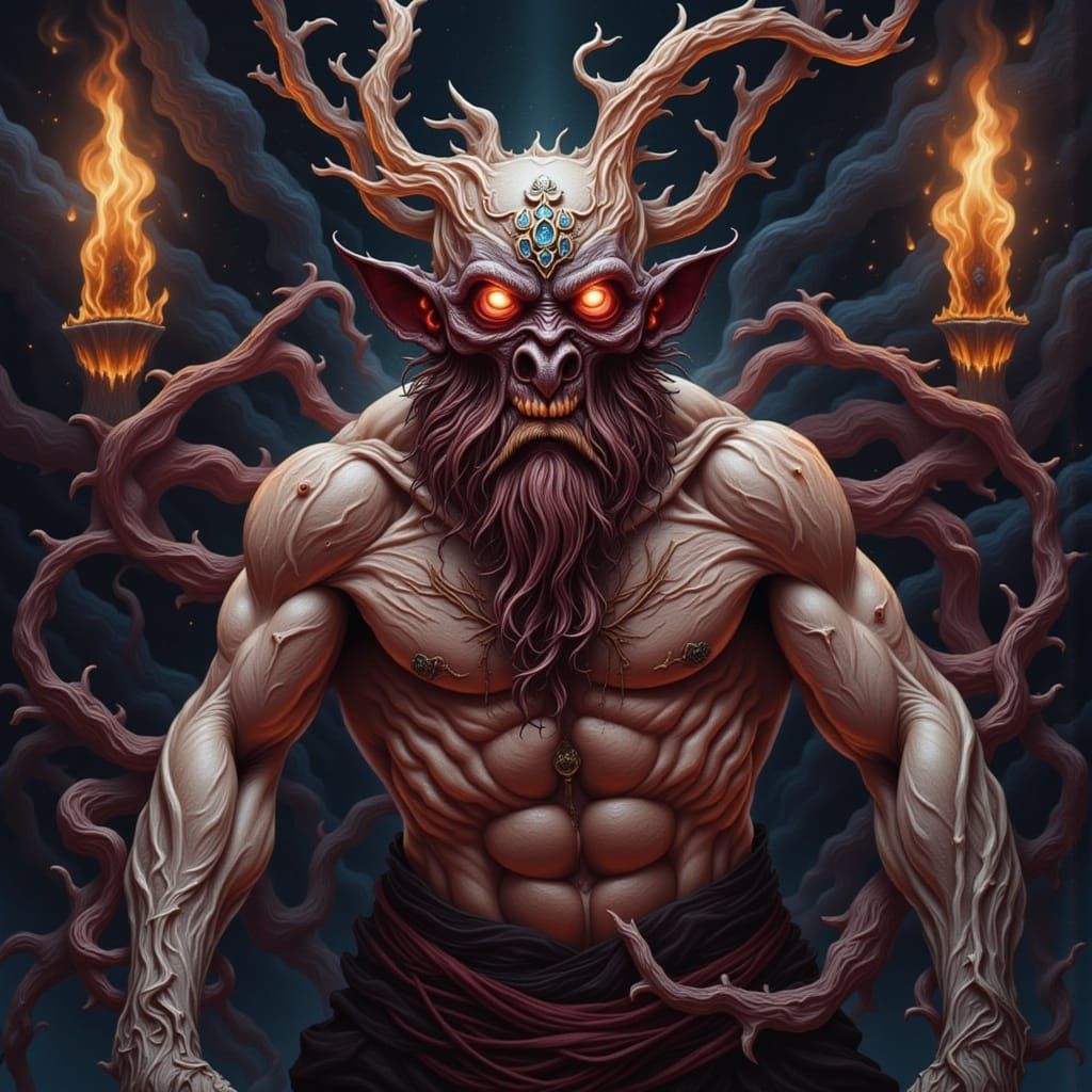 This image depicts a mischievous character rendered in a unique screen print aesthetic with a cursed flux effect. It evokes a sense of playful yet dark intrigue.