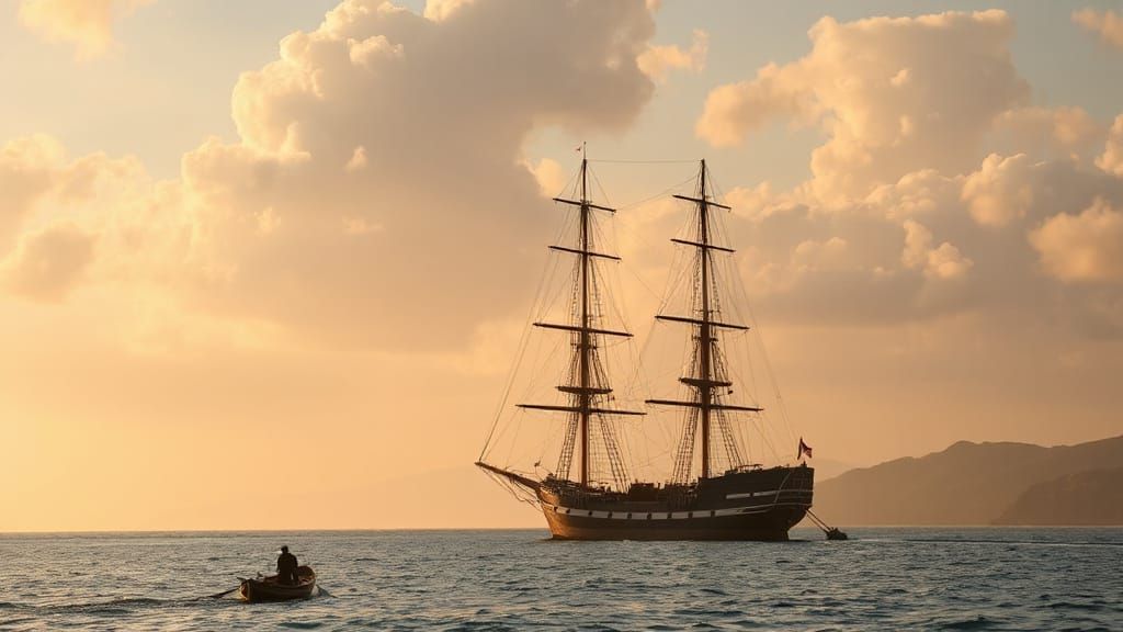 This image shows a three-masted frigate anchored in a South Sea harbor. The scene captures a calm evening with foggy clouds and a small boat with sailors nearby, reminiscent of the 18th century.