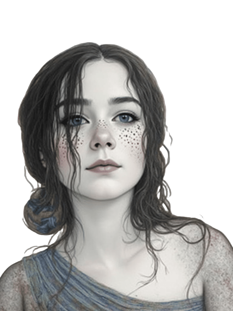 This image depicts a vibrant waterfall scene with lush trees against a bright yellow backdrop. A woman with freckles, wearing a blue hat, is rendered in a Renaissance painting style with dappled light effects.