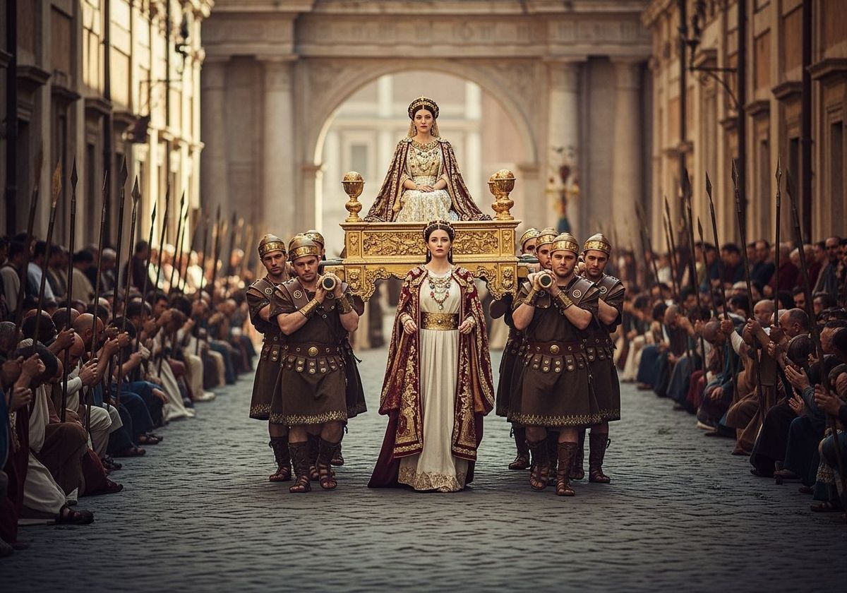 This image depicts a Roman Empress being carried through Ancient Rome on a golden litter. The scene features soft bokeh and warm lighting, reminiscent of classical photography.
