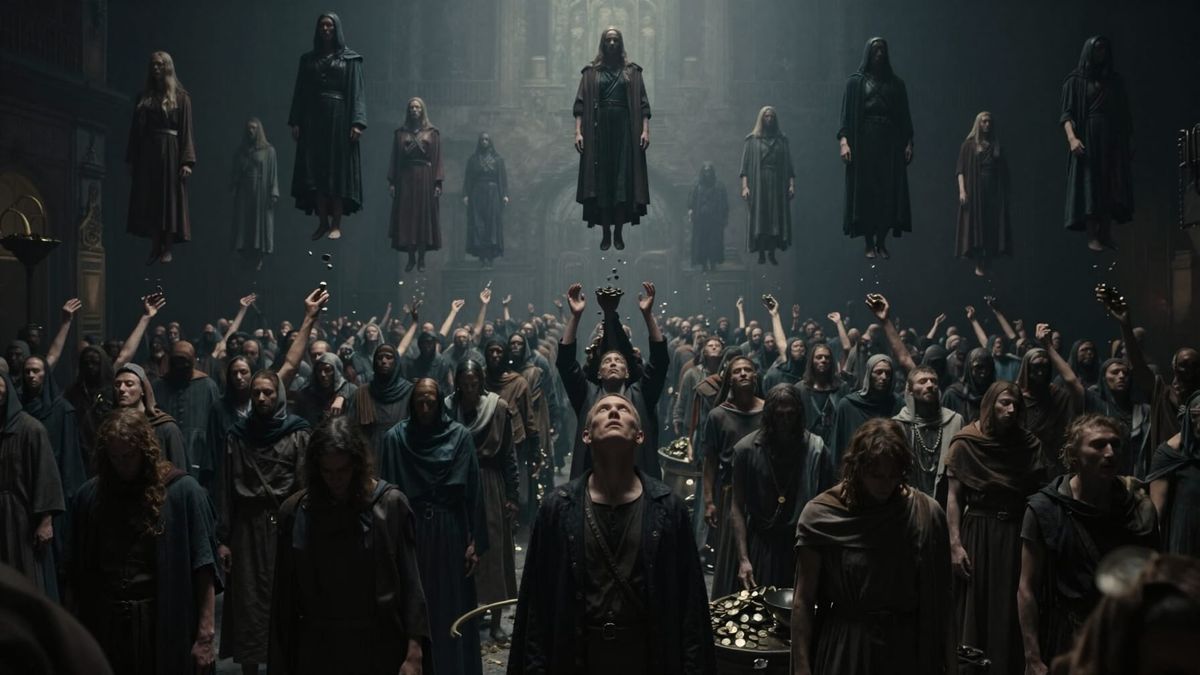 This image depicts a stark, cinematic scene of societal hierarchy. It shows masses in despair, offering sacrifices to unseen elites, with cold lighting emphasizing the oppressive atmosphere. Photorealistic dystopian concept art.