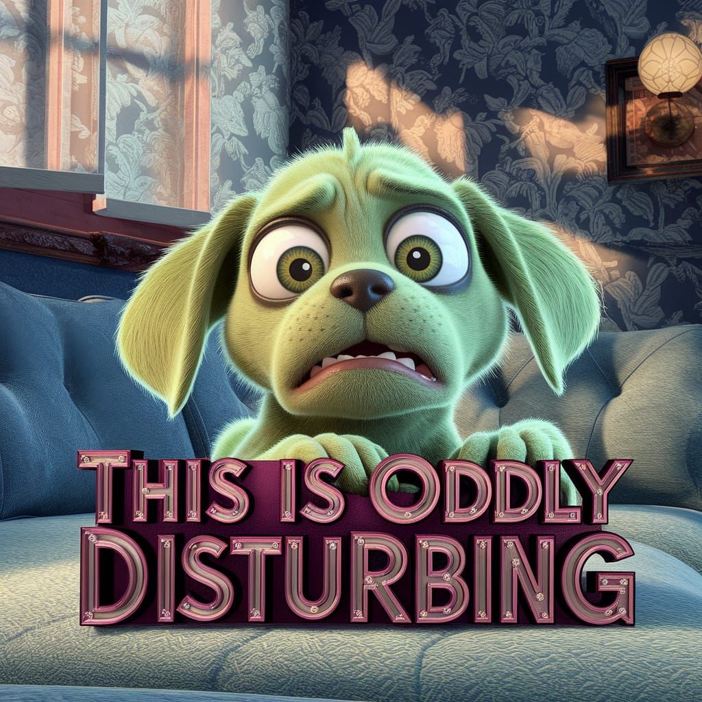 In a cozy living room setting bathed in warm, inviting light, a peculiar, green Pixar-style cartoon puppy sits with a wide-eyed, startled expression, its large, deep-set, buggy green eyes bulging in fear. The puppy's furrowed brow and gaping frown create a striking contrast against the soft, pastel wallpaper ...