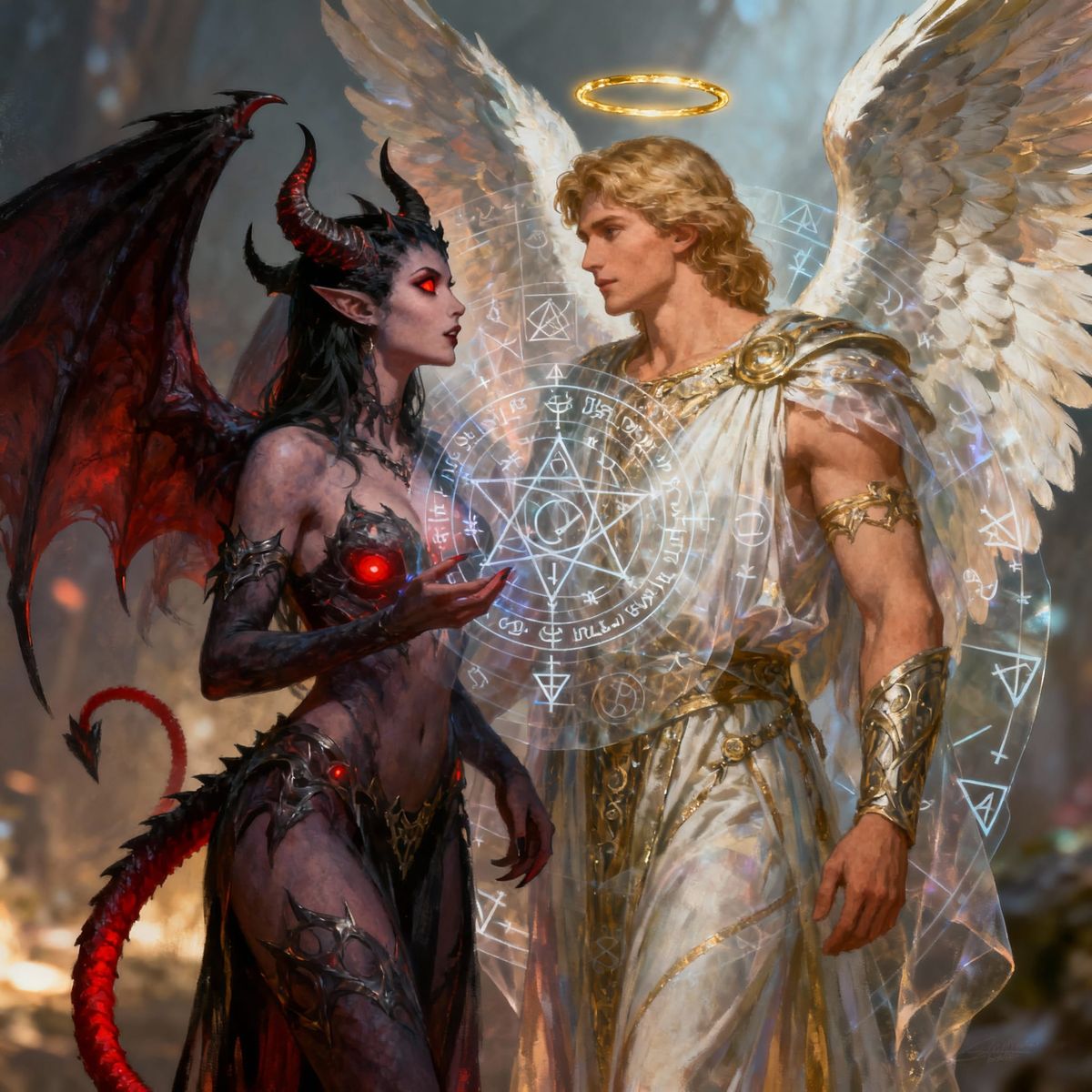 This image depicts a young female demoness conversing with a male angel, rendered in a detailed illustration style with dramatic, romantic lighting and subtle occultic symbols.
