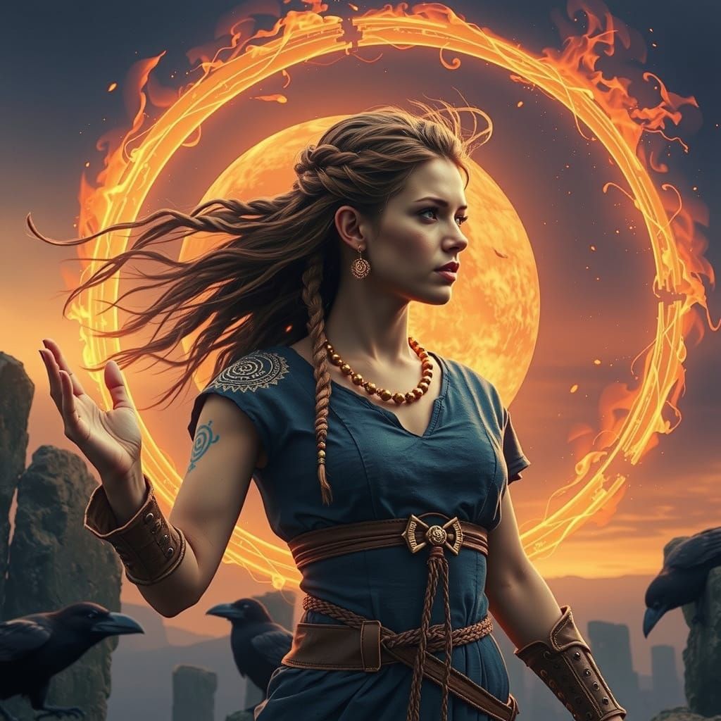 A striking picture of a Celtic warrior woman raising her hands to the twilight sky before ancient standing stones. Her braided hair is adorned with golden beads. Druids, ravens, and smoke surround her in a mystical, ethereal style.