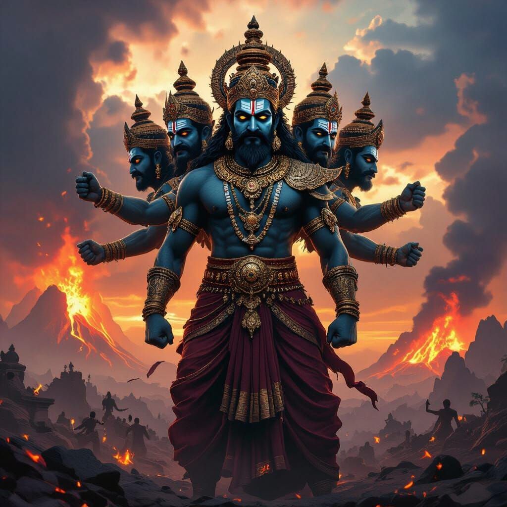 A highly detailed digital painting of Ravana, the demonic king, in traditional South Asian attire. Set against a stormy, war-torn landscape with volcanic eruptions, the scene features dramatic lighting and rich textures in an epic fantasy concept art style.