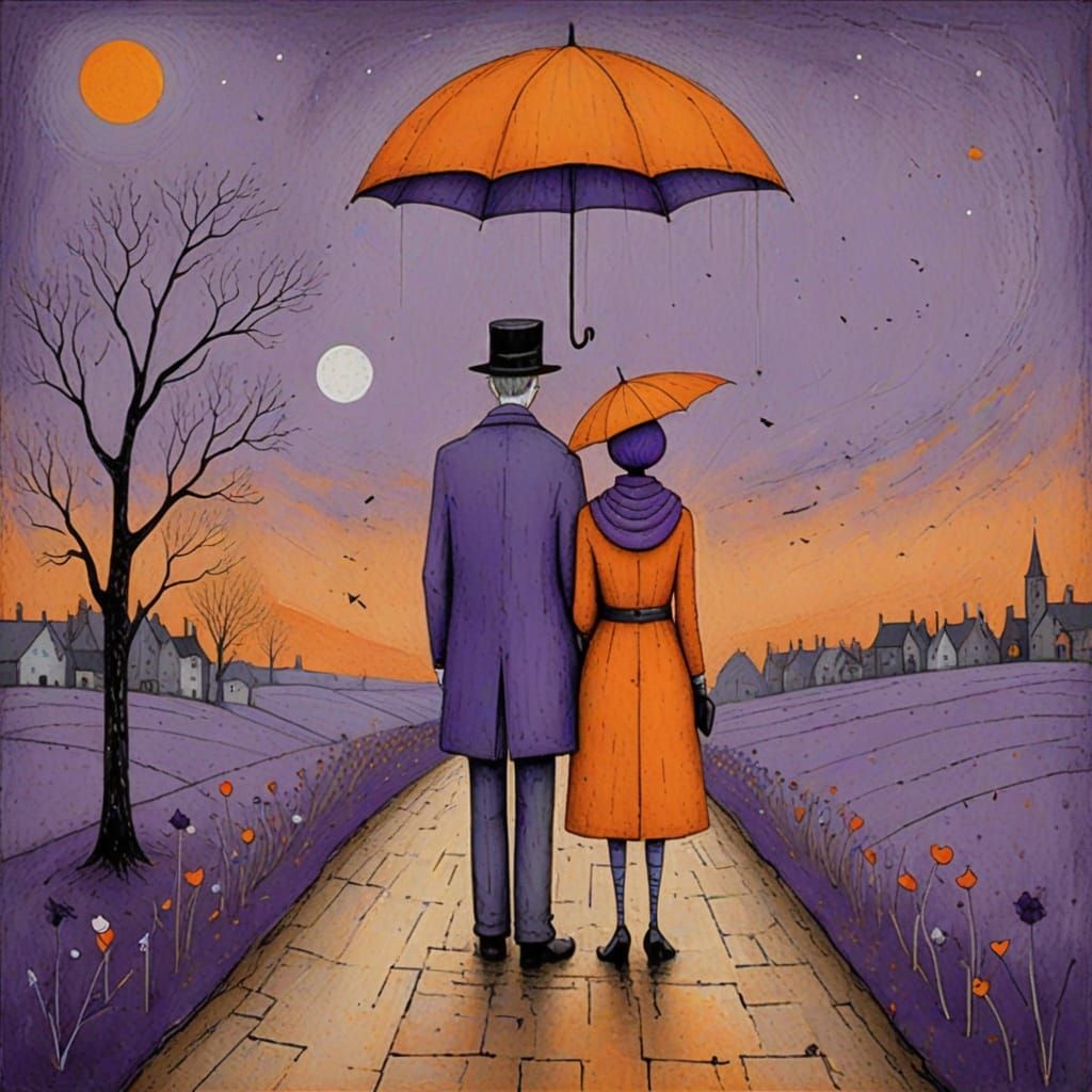 This image is a poignant depiction of a man and woman, their faces etched with sorrow, set against a rich backdrop of blues, purples, and orange hues, evoking a sense of melancholy and heartache.