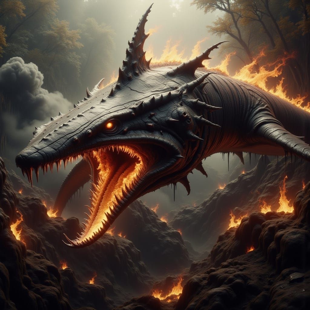 This image depicts a surreal scene of flying, fire-breathing sharks with sleek, sinuous bodies and sharp teeth, evoking a sense of high-fantasy and Hyperrealism.