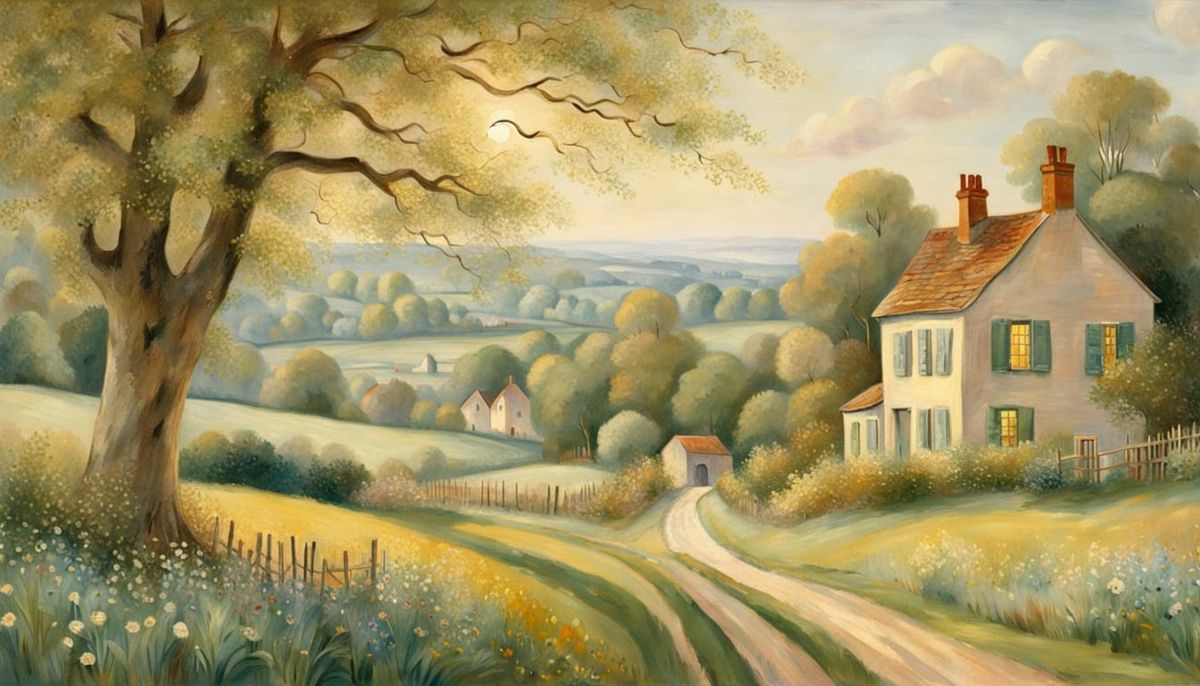 This idyllic image captures a charming rural village nestled in a serene valley, surrounded by rolling hills and vibrant wildflowers. The soft, golden light and lush greenery evoke a dreamy, storybook atmosphere reminiscent of folk art traditions and Impressionist brushstrokes.