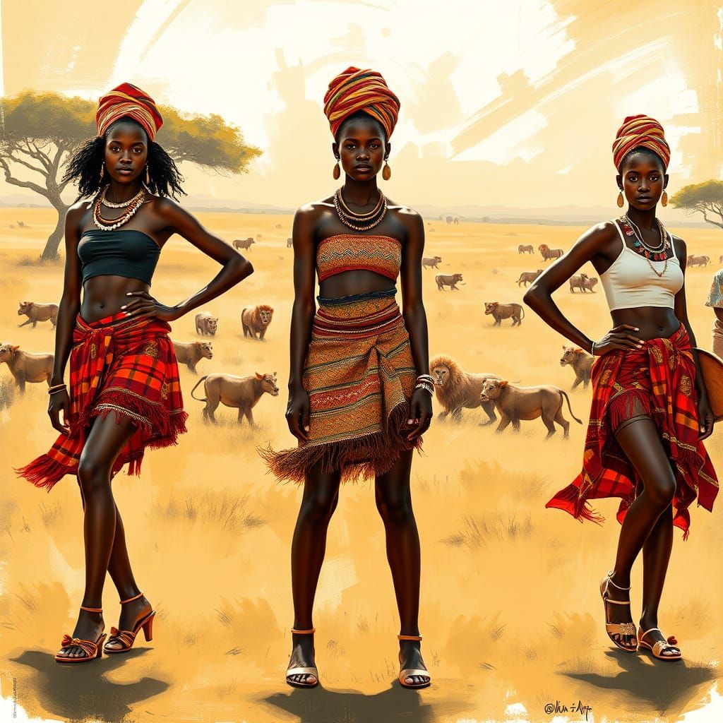 This image shows women modeling a fusion of modern and traditional styles, inspired by Kenyan tribes, in a sun-kissed savannah landscape with lions in the background. The artwork blends expressive brushstrokes and earthy tones with dynamic movement, evoking a sense of confidence and summer fashion.