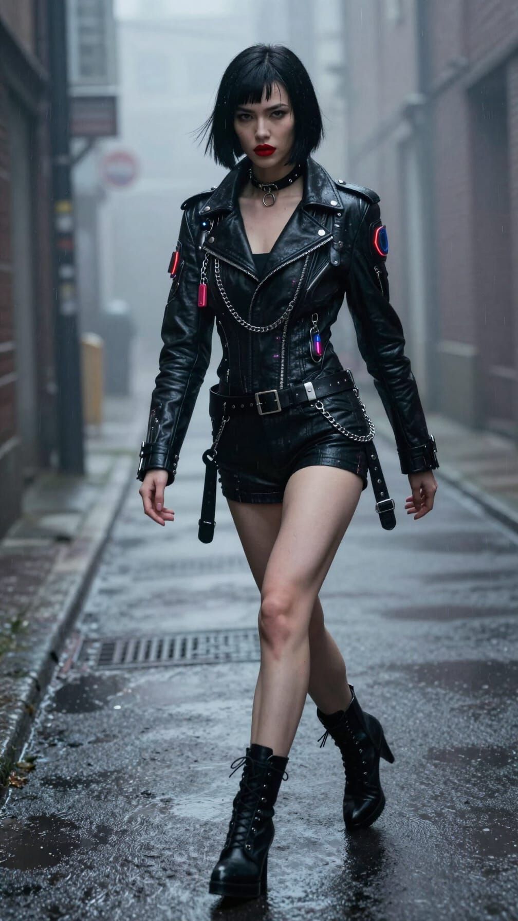This hyper-realistic image shows a fierce young woman in a cyberpunk alley. She wears a futuristic jacket and boots, with dramatic lighting highlighting details and rain effects.