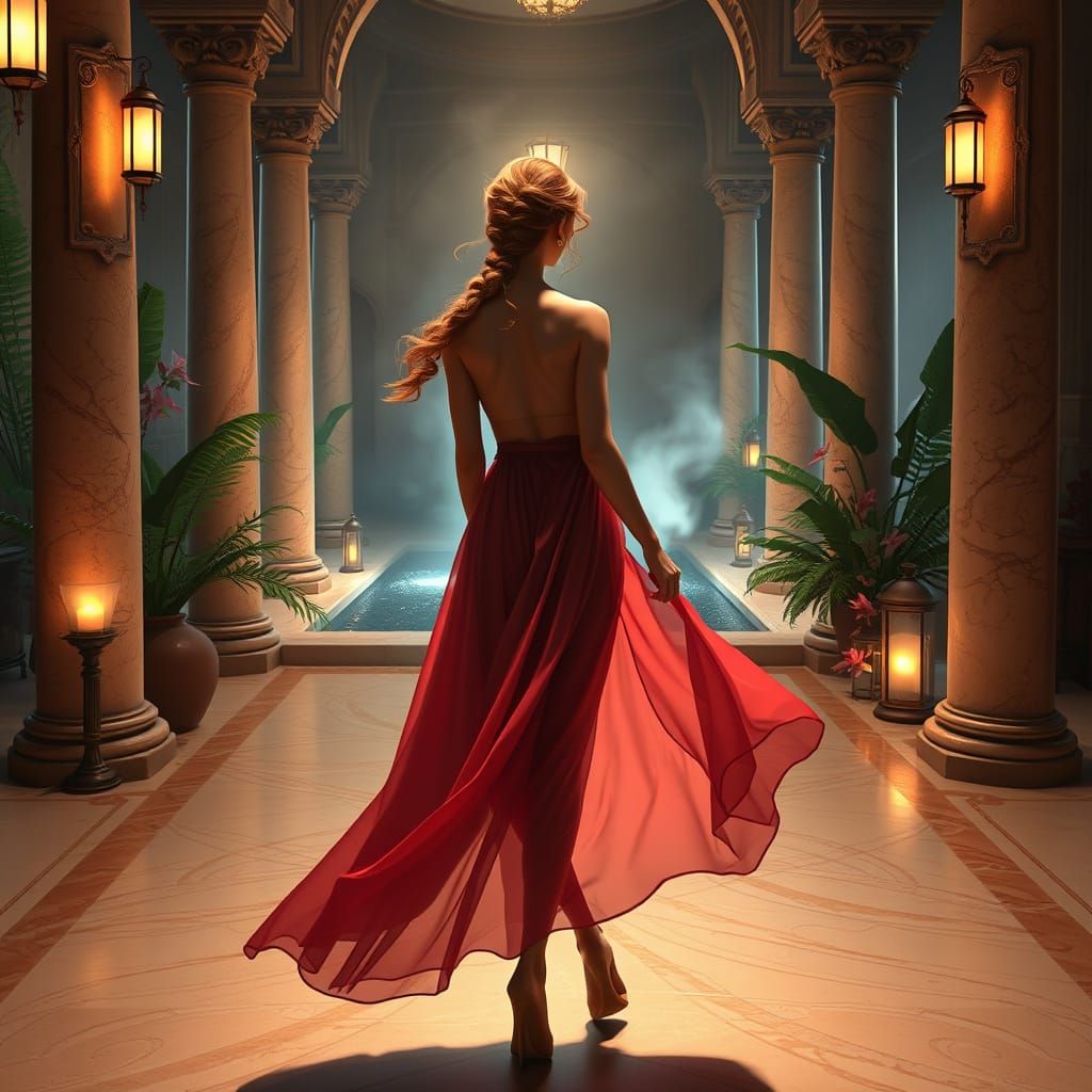 A young woman is draped in a rose-tinted fabric, surrounded by the soft glow of lanterns and the misty veil of vapour in an opulent medieval spa setting, with intricate marble patterns and lush greenery