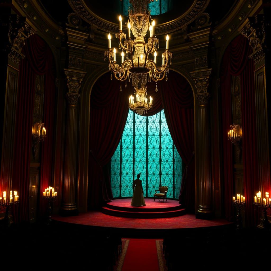 This image depicts a dramatic, cinematic scene from an opera set, featuring a stage, crimson curtains, and chandeliers. The atmosphere is eerie, with a music box playing a childhood lullaby in reverse, adding to the sense of unease.