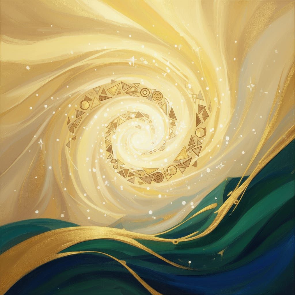 This AI-generated artwork features a dynamic swirl of warm gold and cool jewel tones, with fragmented shapes and sparkling white lights creating a sense of upward motion and celebration. Rendered in hyperdetailed concept art style.