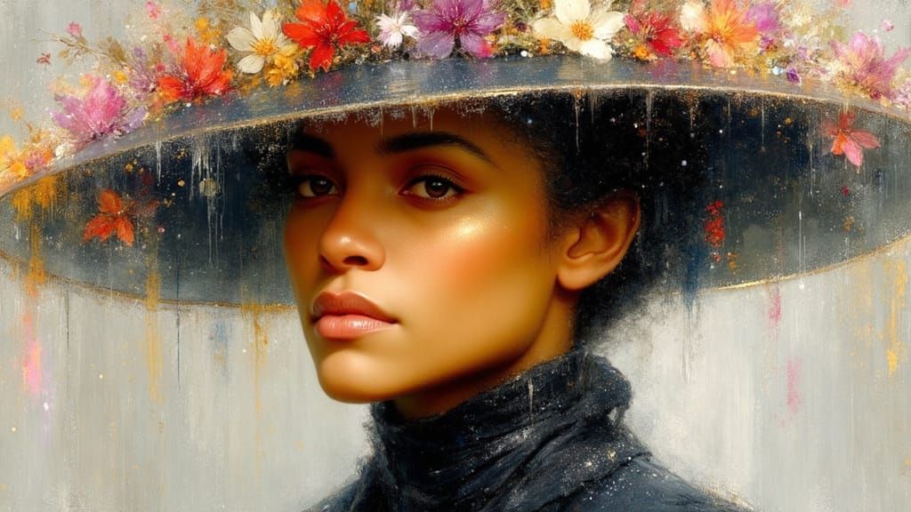 This vibrant portrait depicts a flower seller in a London street scene, captured in a bold and colorful dry brush style reminiscent of Diego Rivera and Luis Royo's elegant works.