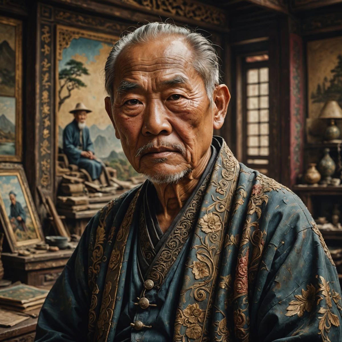 This image shows a stunningly detailed Asian sage set amidst a richly textured and atmospheric backdrop, evoking a sense of cinematic grandeur.