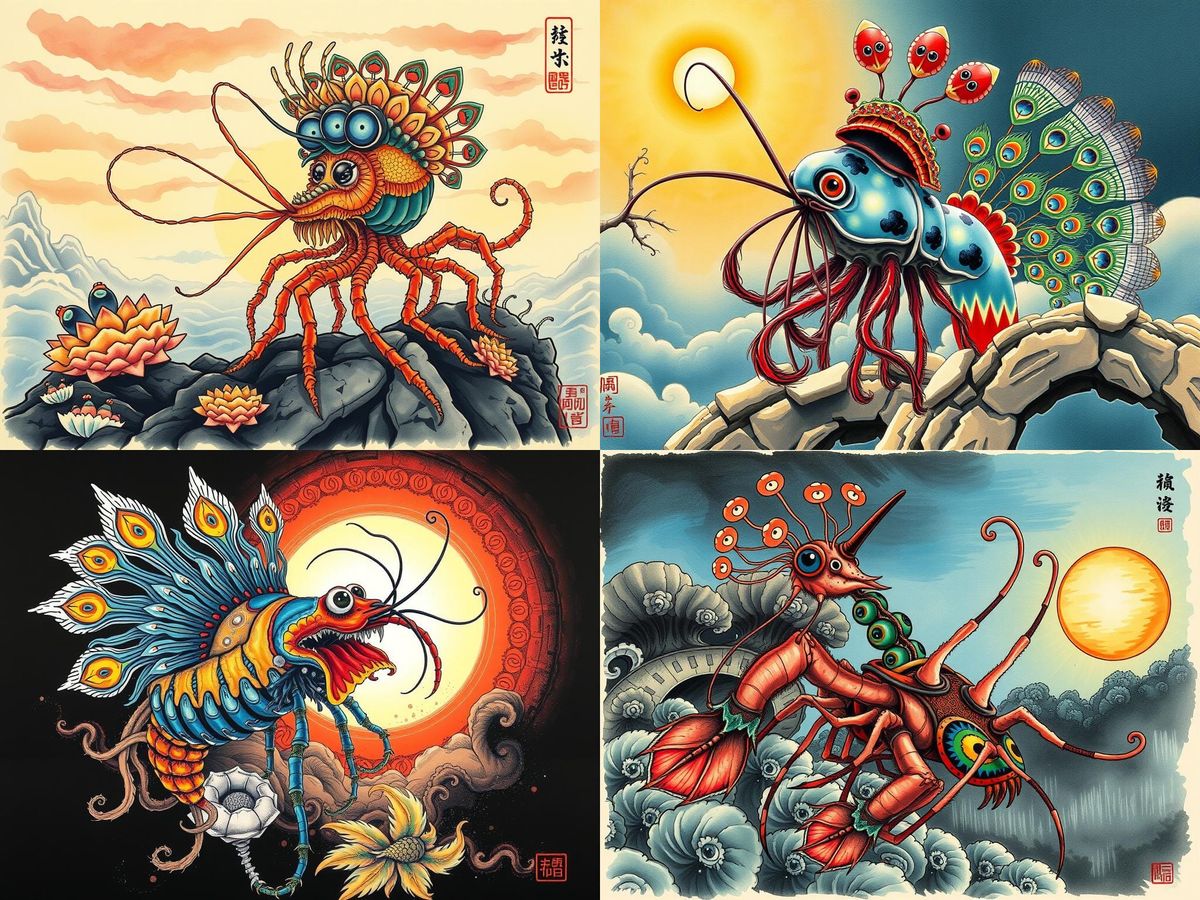 A vibrant digital rendering of a bizarre creature. The hybrid jellyfish peacock prawn homunculus is illustrated in a traditional Chinese ink painting style with high detail.