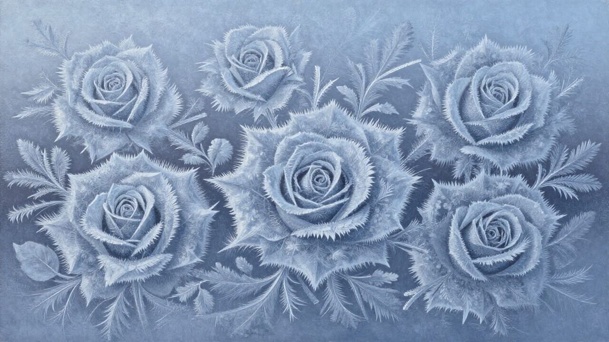 This image showcases a detailed matte painting of a window covered in hoarfrost, forming delicate rose patterns. Refracted light adds subtle hints of color to the icy art.