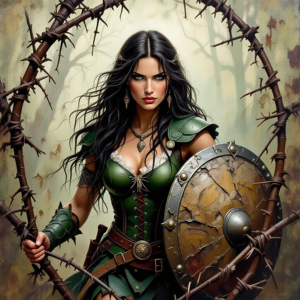 A striking picture of a forest goddess pushing through a thicket. Rendered with bold, tactile brushstrokes and a misty palette of browns, creams, and greens, in the style of romantic impasto.