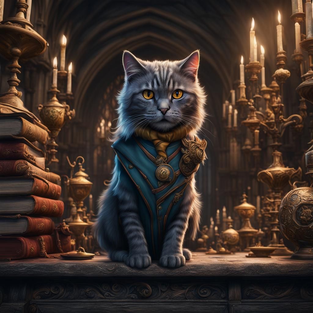 A detailed matte painting of a cat in the style of Harry Potter. The image features deep colors, fantastical elements, and intricate details, reminiscent of fantasy concept art.