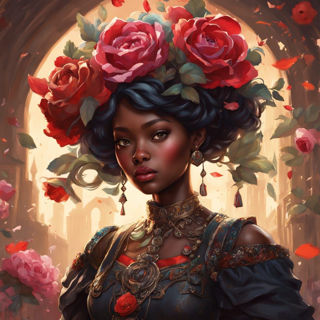 A concept art portrait of a Black Blythe doll in a detailed princess dress with roses. Features vibrant colors, dynamic lighting, and intricate boots, presented in a hyperdetailed, Unreal Engine 5 aesthetic.